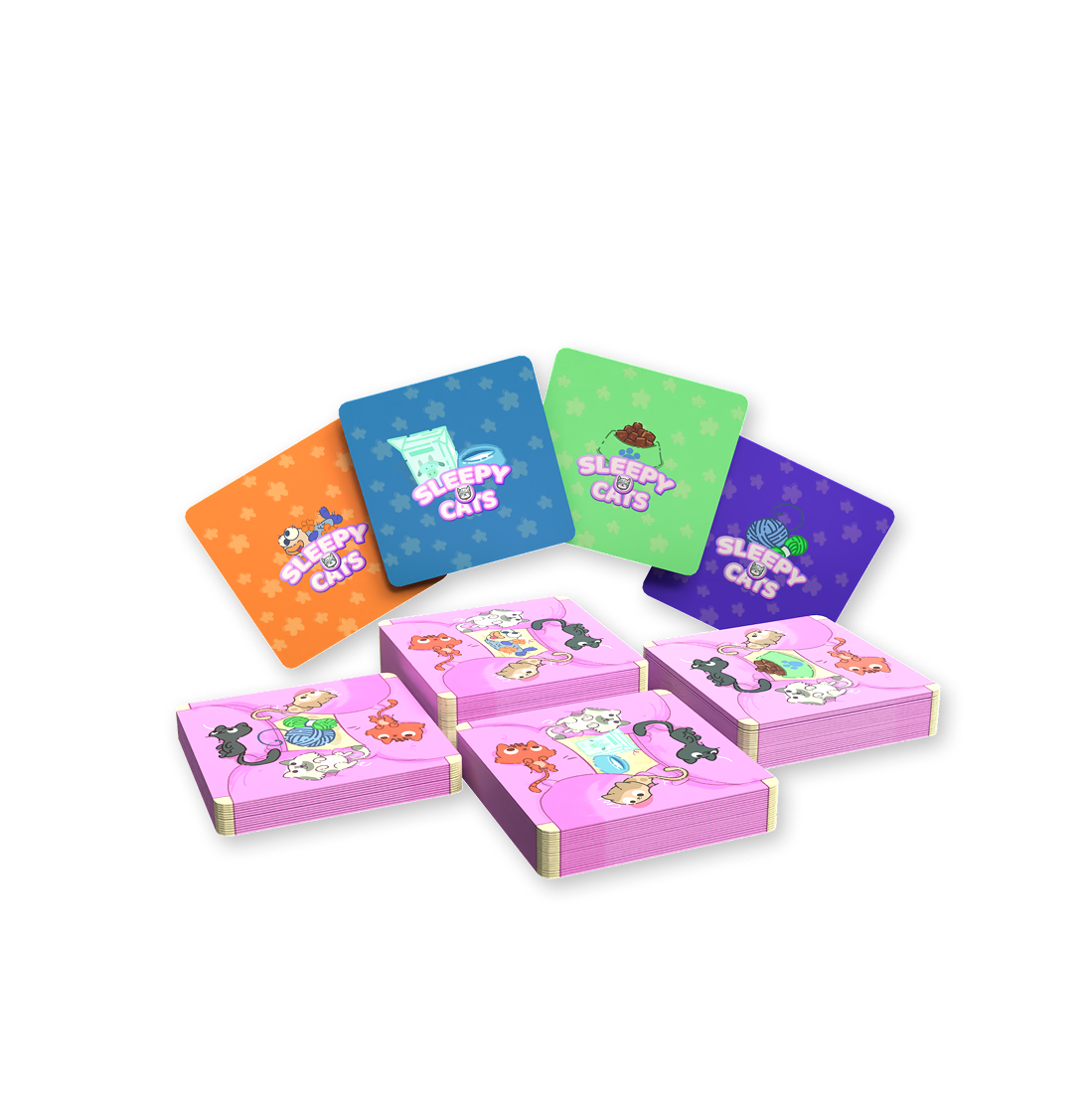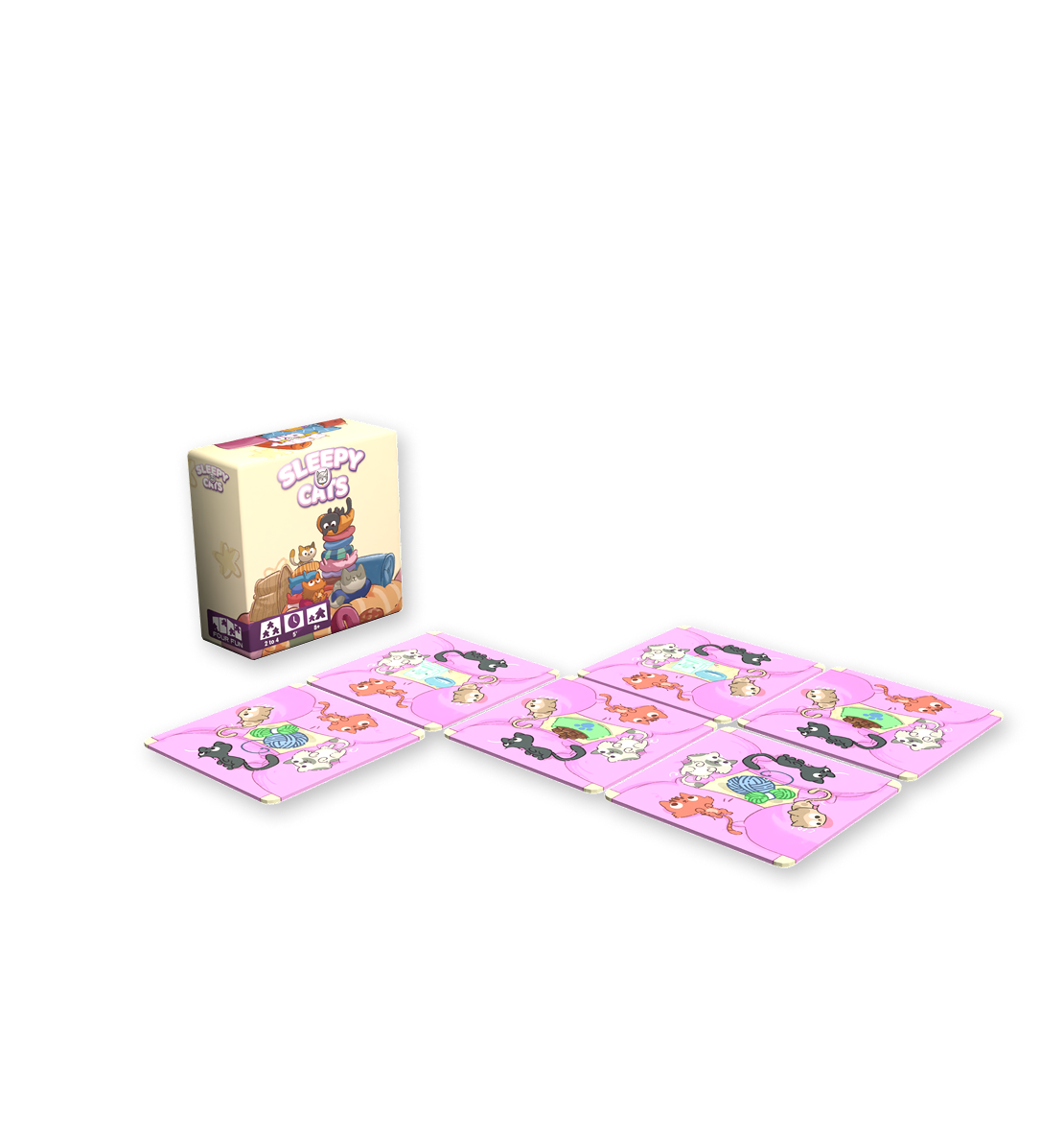 Place cats next to each other. Similar cats like to sleep near, but be careful! They need to be around different food or toys to be valid matches, otherwise you will be eliminated! The first player to run out of cards wins!